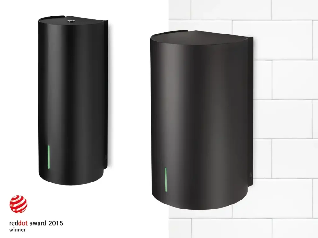 Så vi indledte et samarbejde om at få tegnet en linje og skabt et stramt, skandinavisk udtryk. Fokus blev lagt på at få seriens forskellige produkter til at harmonere, når de hænger i samme rum og ofte mange sammen. I processen kom diskussionerne også omkring størrelse på logo, og om hvorvidt man kan have en vandret top på en håndtørrer – nu hvor man ikke længere må ryge på offentlige toiletter.