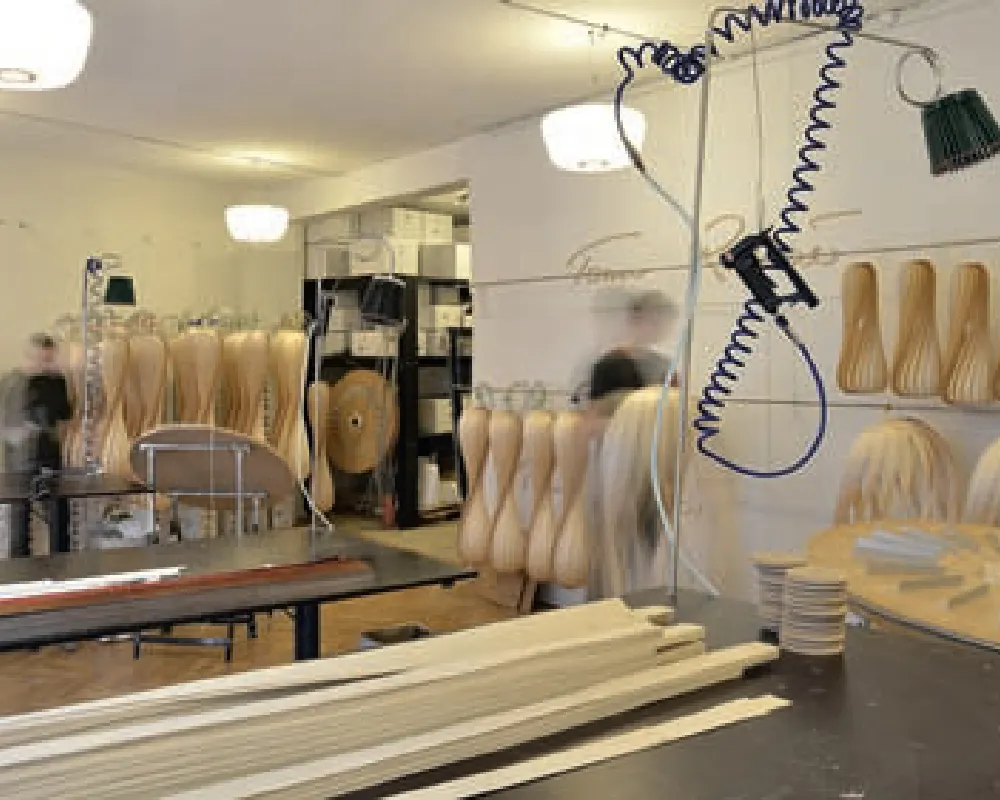 For eksempel er hans bestseller, den såkaldte TR7-lampe, skabt ud af den enkle idé at bøje og vride en lang strimmel birkefiner, så den danner et S. Gentag derefter princippet mange gange efter hinanden, og den ikoniske, lukkede timeglas-lampesfære er født. Et helt klart udtryk – og ganske enkelt.