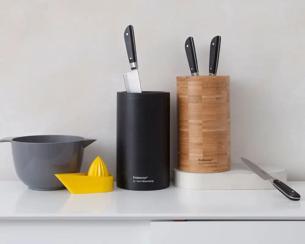 – Man får altså ikke blot en yderst funktionel kokkekniv i hånden, men også glæden ved godt design og hele signalværdien. Det emmer af kvalitet. Og samme kvalitet og æstetik har Endeavour Knivblokken, der skånsomt opbevarer kokkeknivene i flot og slidstærk bambus.