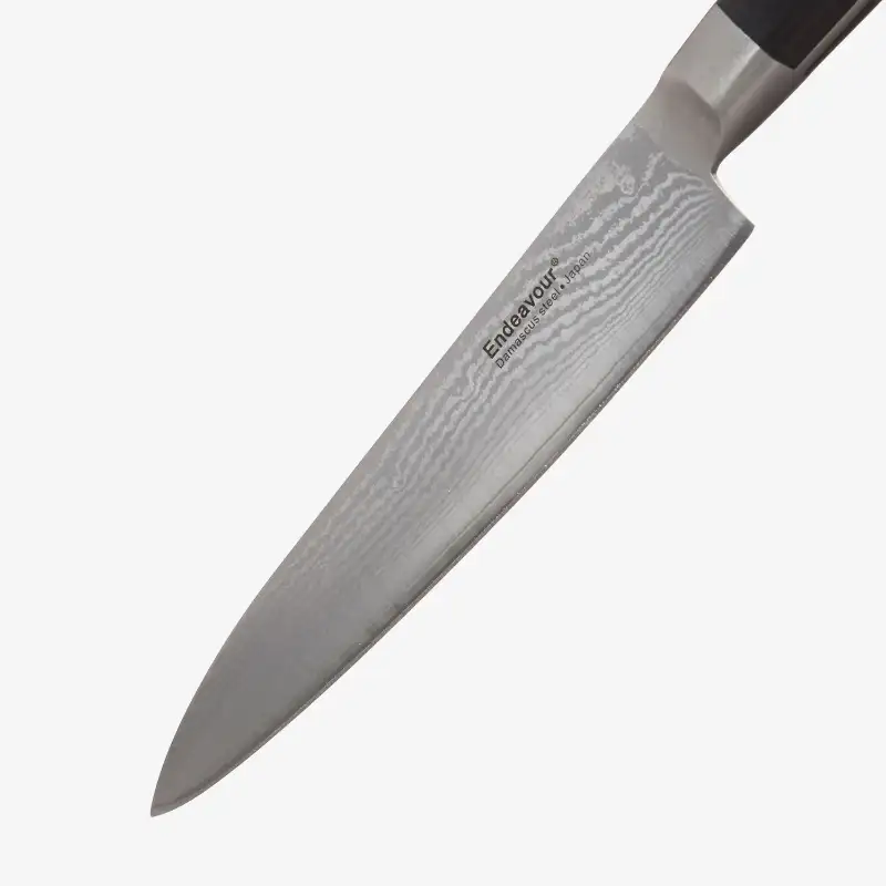 Der er vægt bag ordene, når vi taler Endeavour, materialer og viden om historiske håndværkstraditioner. Knivene er således fremstillet af stærkt Damaskus-stål efter traditionel, japansk damasceringsteknik, og de består af 33 lag sammensmedet stål på hver side af knivbladenes midterstål.