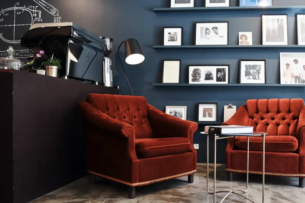 Det er en ambition, der også afspejler sig i indretningen. Der har været en designer inde over, men ellers har Helle Hein og Thomas Walbom selv forestået indretningen og den hyggelige, eklektiske stil, der bl.a. kombinerer loppefund med designglasskabe og skaber en næsten hjemlig atmosfære i kaffehjørnet. Sådan kan man også starte et muligt brillekøb; slappe af, nyde en kop kaffe foran butikken – endda to go! – se sig omkring og få professionel rådgivning om briller og kontaktlinser, hvis man ønsker det.