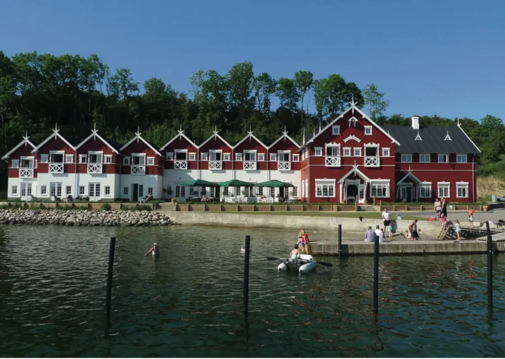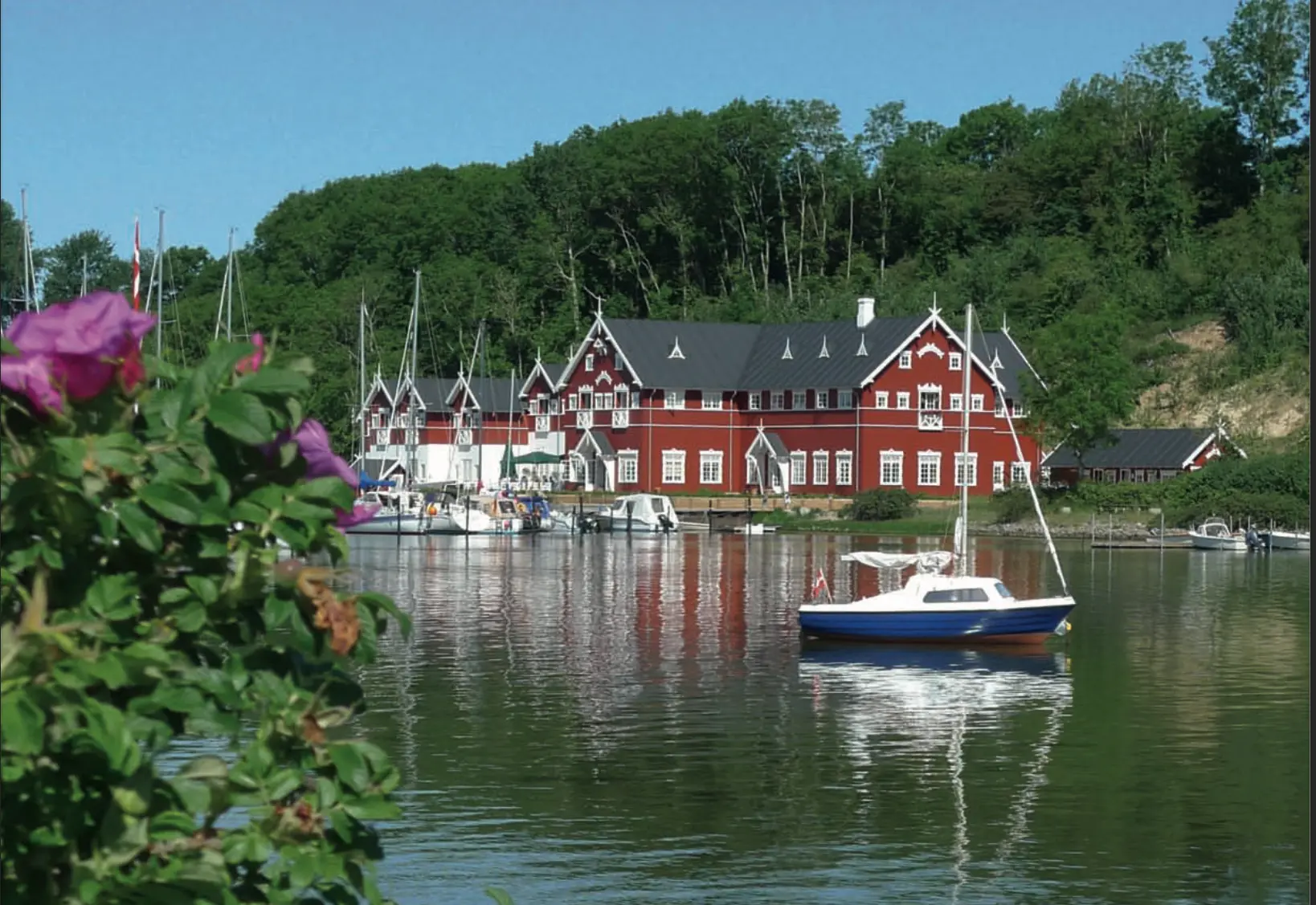 Dyvig Badehotel ligger som en perle i vandkanten – helt nede ved den lille stemningsfulde lystbådehavn med de mange maritime sommergæster. Det røde træværk med fine hvide detaljer, et væld af blomster ude og inde og de klassisk indrettede stuer og værelser, sender straks tankerne tilbage til de gode gamle dage omkring 1930’erne, men faktisk er hotellet kun få år gammelt.