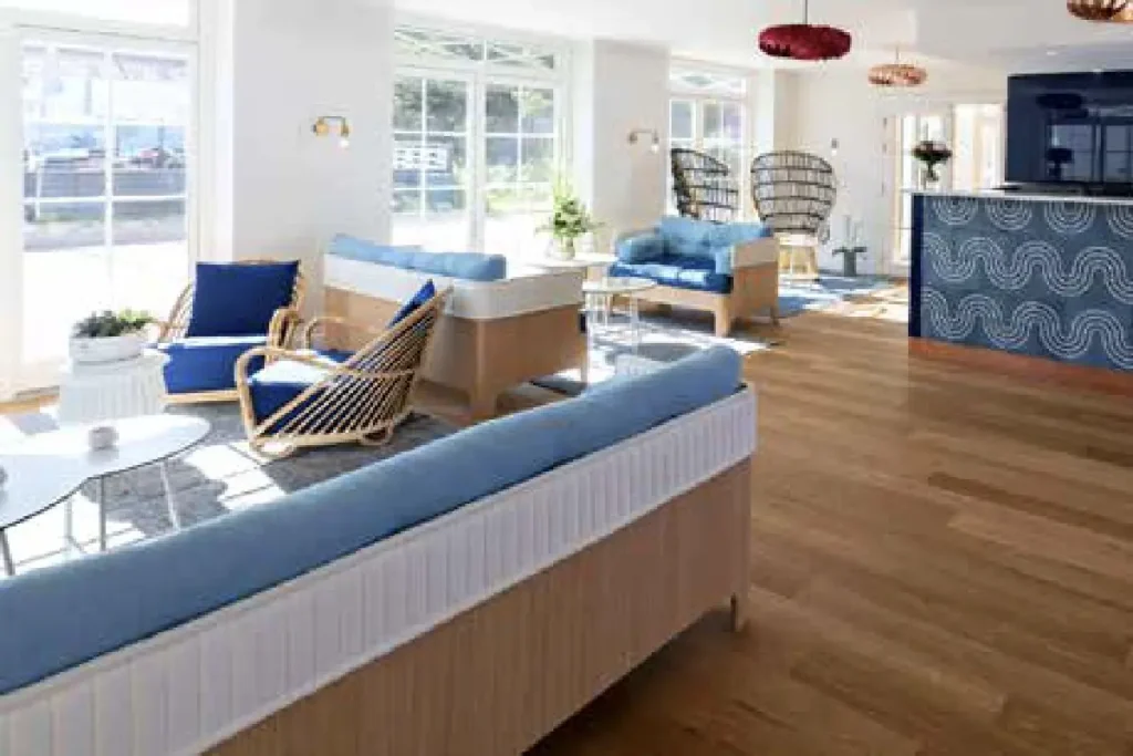 Her om formiddagen er der ikke hvide duge på bordene i restauranten, som der er om aftenen, men i stedet blot en afslappet atmosfære og rå borde med en dybblå farve, der igen minder os om det altid nærværende Vesterhav og Jammerbugt næsten lige uden for vinduerne. Et stykke kulturhistorie har fået uventet nyt liv bag klitterne på kanten af landet med Danmarks første badehotel i nyere tid – Strandhotellet Blokhus.
