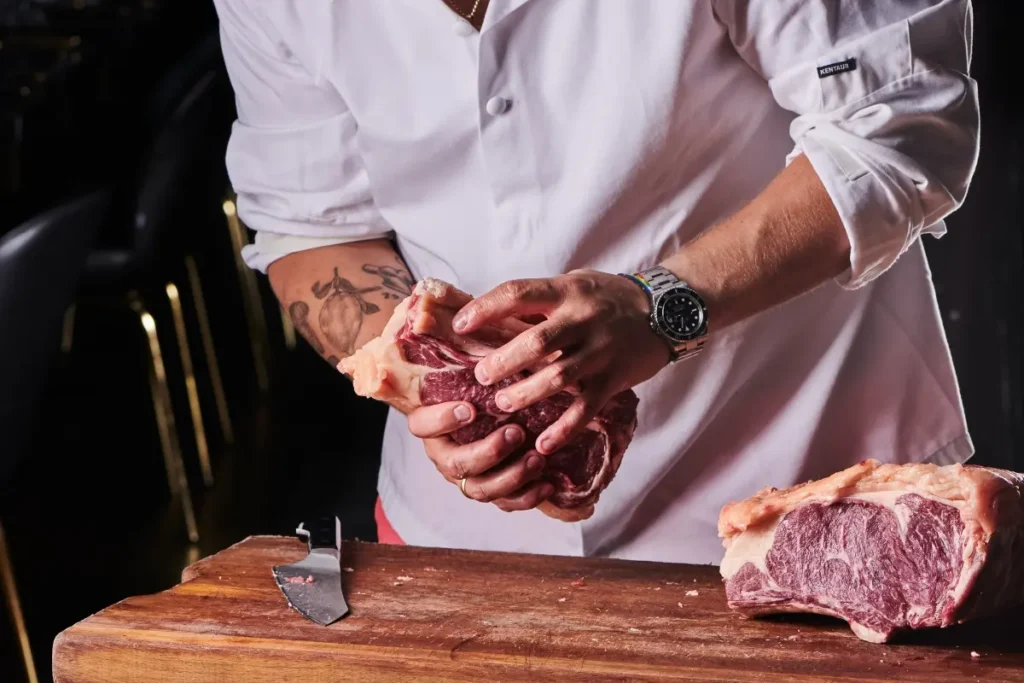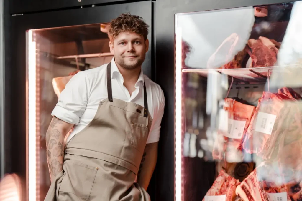 ”Jeg bryder mig ikke om kød, der er dry aged i 90 dage. Efter 14 dage mister kødet næsten halvdelen af sin væske og får en animalsk smag, jeg ikke synes om. Vi modner i syv til ti dage og bruger smør til at bibeholde saftigheden og smagen. Det giver en langt mere delikat oplevelse.”